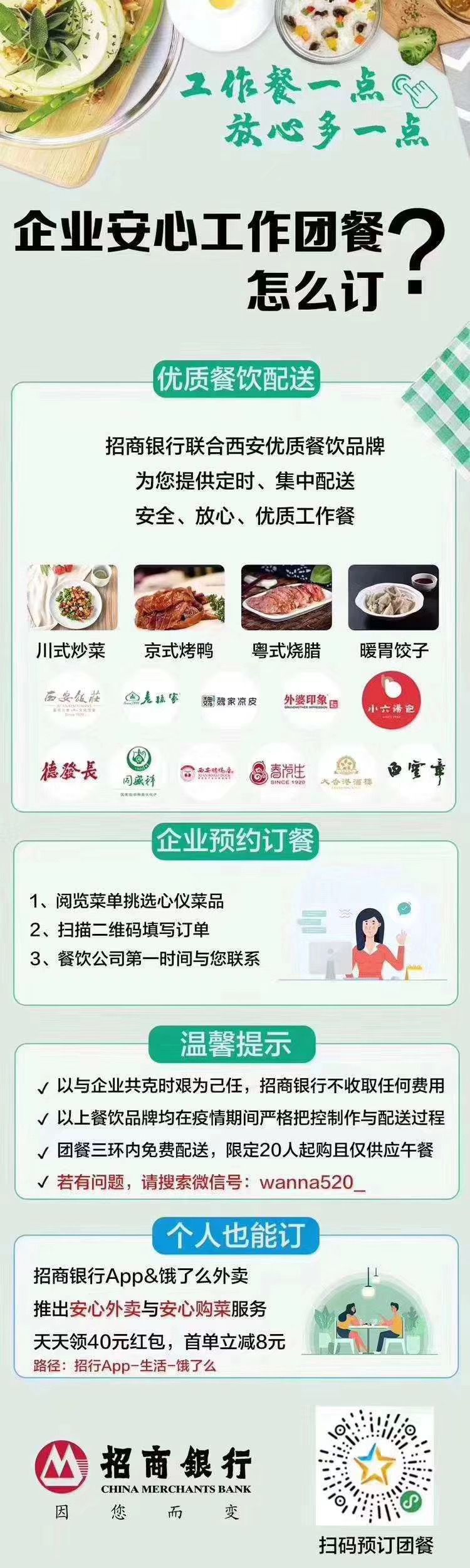 据了解,除为企业提供放心复工餐外,招商银行西安分行还与“饿了么”外卖平台合作,面向个人客户提供“安心外卖”与“安心购菜”服务,做到原料严筛选、制作严把控、配送无接触的外卖服务,积极解决民众用餐难题。
